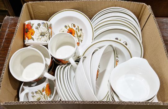Part J&G Meakin ironstone Poppy pattern part breakfast service including bowls, coffee mugs, a milk jug, plates and other items