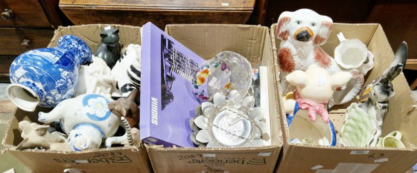Assorted ceramics and other items including reproduction Staffordshire pottery-style model of a spaniel, various pottery and resin and other models of cats, a Wedgwood mid-19th century Staffordshire pottery blue and white transfer-printed vase, assorted items of silver plate including serving dishes, flower-shaped basket, trivets and a cased set of mid-20th century Sheffield cutlery and a boxed set of Viners Executive Suite pattern flatware and other items (3 boxes)