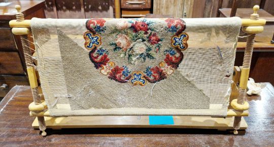 Victorian cut and engraved glass wine decanter and stopper cut with lenses and engraved with fruiting vine, a group of silver plated flatware, two 19th century cut glass stoppers, a Copeland and Spode stoneware part dinner service printed and painted with vignettes of fruit, a continental pottery baluster table lamp, an Italian majolica footed lobed bowl, an early 20th century turned wood tapestry table-top work frame with floral worked tapestry, 66cm wide and other items