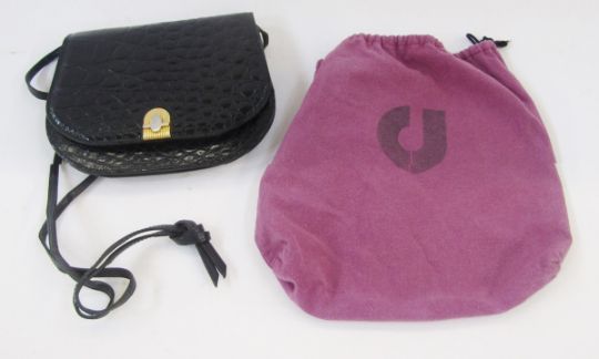 Assorted vintage bags to include a vintage crocodile bag, a dark brown patent bag printed with alligator pattern, a Ferdin clutch bag with a chain and other bags (1 box)