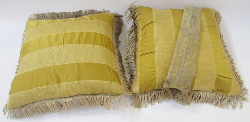 Pair of silk backed Fortuny cushions with cream coloured braid detail, one narrow tie back/hanging, 48.26cm x 48.26cm