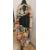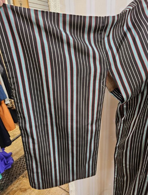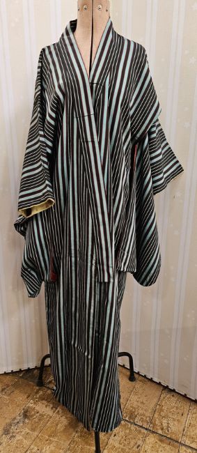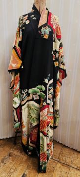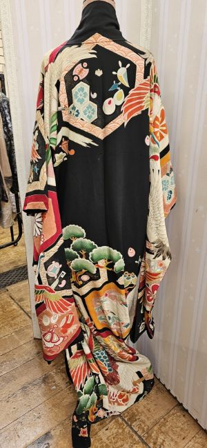 Kimono, printed with cranes, flowers, abstract patterns, bright colours on a black ground and another silk kimono, turquoise, black and white stripes (2)