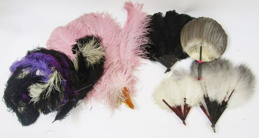 Large quantity of ostrich feather fans and feathers, the fans mainly with tortoiseshell