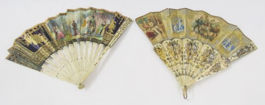 Various fans, bone, carved sticks and guards, painted decorations (damaged), a fan painted with pastoral scenes to include figures with a donkey, a couple with a baby, a young couple fishing, gilt cut decorations to the sticks and guards, a gilded fan with plain silk and spangles on one side only, a black wooden painted fan, a red silk fan decorated with swansdown, dyed red, and two other fans (7)