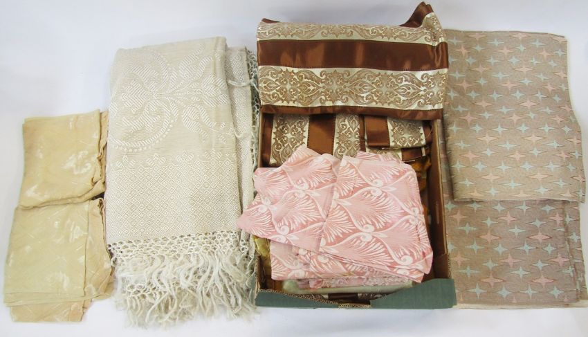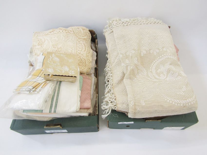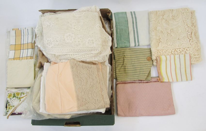 A quantity of vintage fabrics, including a pair of yellow curtains, 78" long by 38" wide, a vintage metal box embossed with roses and containing a lace and embroidered handkerchiefs, assorted net curtains, table linen etc (2 boxes)