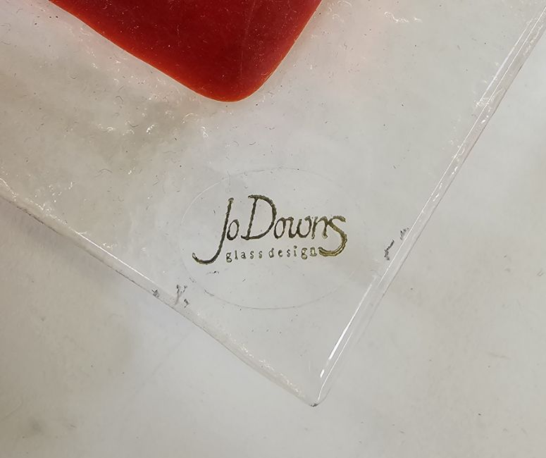 Joe Downs art glass shallow dish, square with four rows of four polychrome raised squares, 37cm square