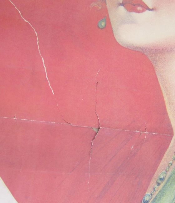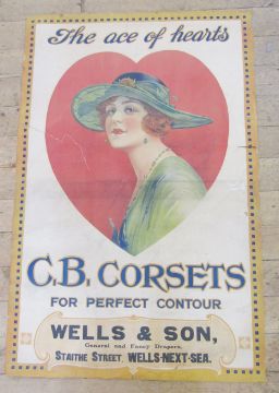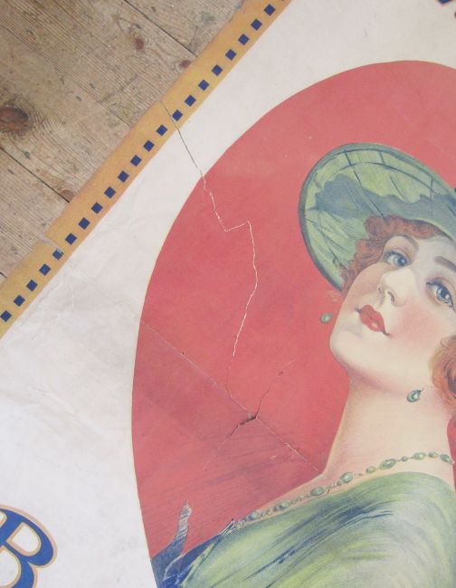 A 1920's large paper advertising poster for G B Corsets - depicting a girl wearing a straw hat, fragile and with some tears, 150cm high x 97cm wide approx..