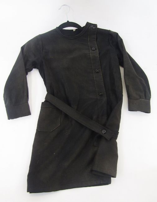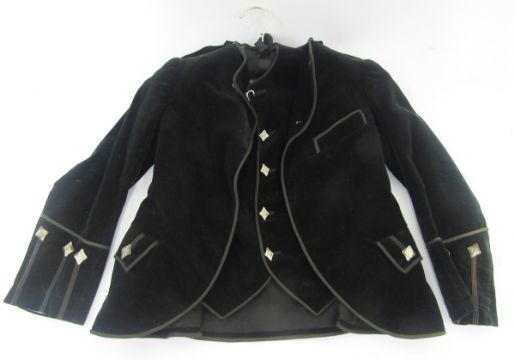 Child's velvet jacket, military-style, with matching waistcoat, silver-coloured metal buttons, embossed with thistles and a child's black cotton work/artist's smock with side button fastening and belt, with long sleeves (2)