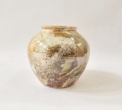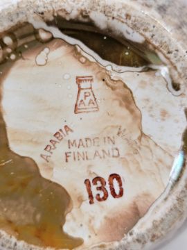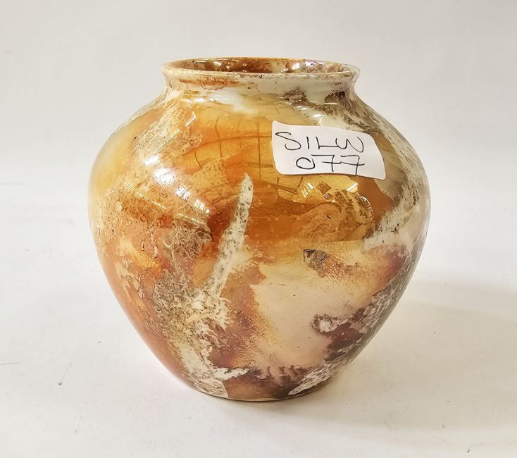 Arabia Finland pottery vase, shouldered and slightly tapered with marbled orange, gold and grey lustre, no. 130 to base, 11cm high x 11cm diameter overall