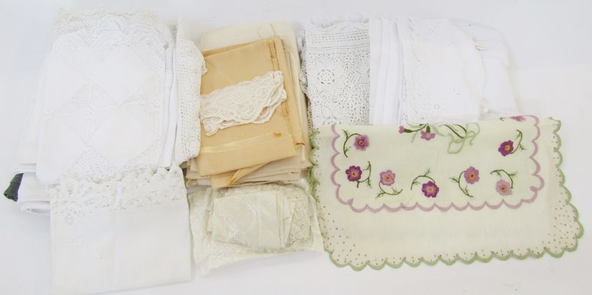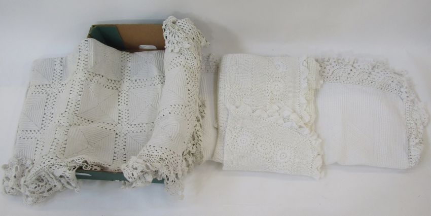 A large cotton waffle bedspread with crocheted border, a fine crocheted bedspread, and a coarse cotton crocheted bedspread, and a quantity of table linen (2 boxes)