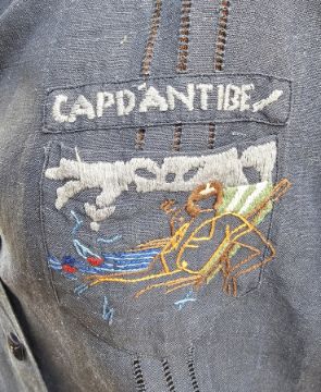 Vintage Emmanuel Khanh Paris black embroidered short sleeved shirt, a blue linen Emmanuel Khanh skirt embroidered cap d'antibes on the pocket, and a Fiorucci sleeveless cardigan, knitted and patchwork, Art Deco style buttons, button fastening (one broken) (3)