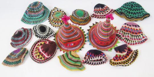Two cotton tie carnival hats and a quantity of ethnic crocheted bucket hats in various sizes and colours (1 box)