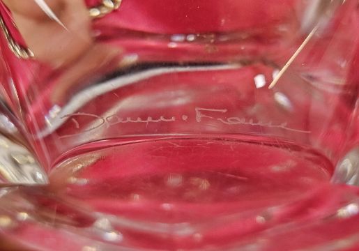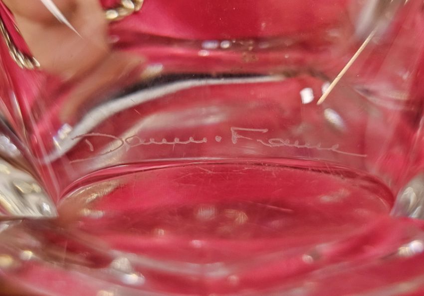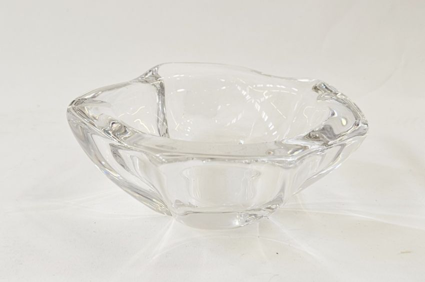 Daum clear glass bowl, irregular shaped and panelled, etched Daum, France to the side, 16.5cm wide x 6.5cm high