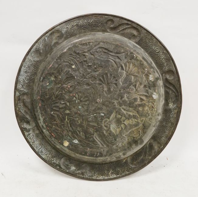 Keswick School of Industrial Arts, Arts & Crafts circular copper charger, the central repousse panel of Persian style flowers surrounded by a decorative scroll border, stamped KSIA, 46cm diameter (has been drilled through centre for wall mount)