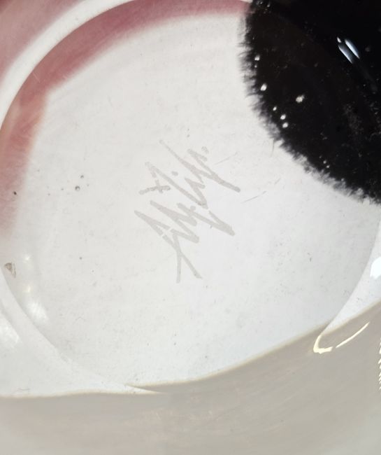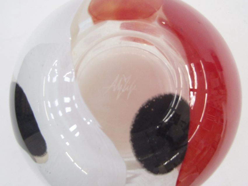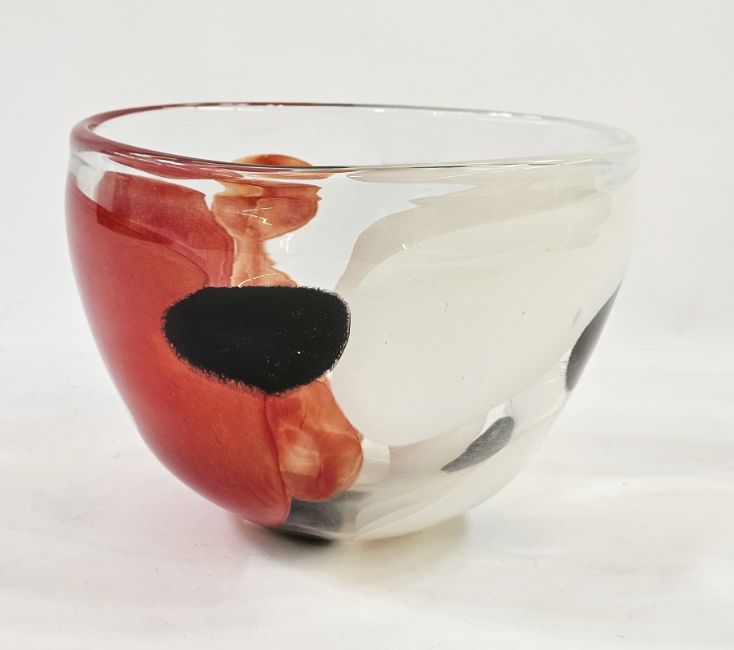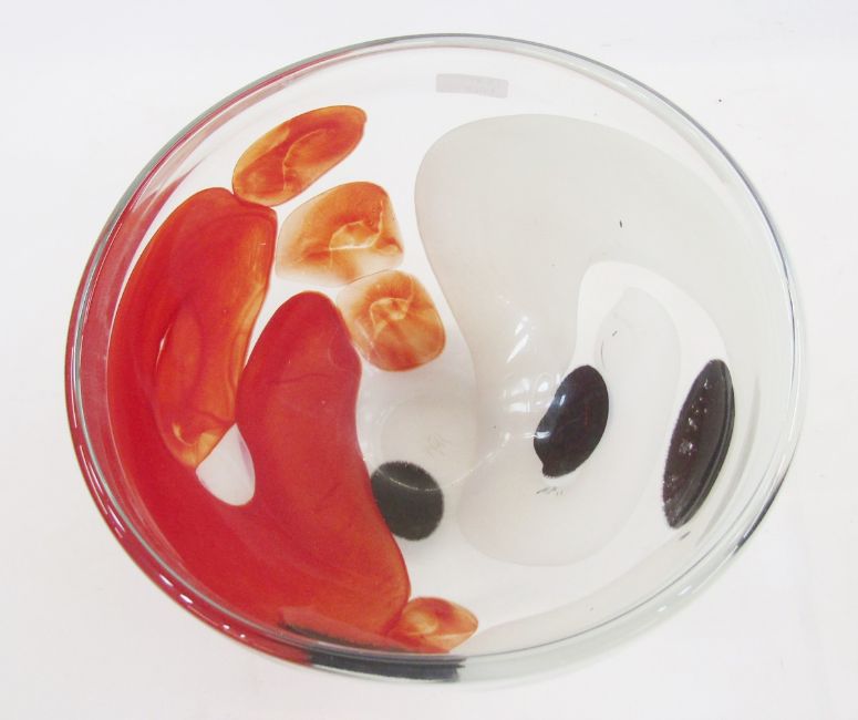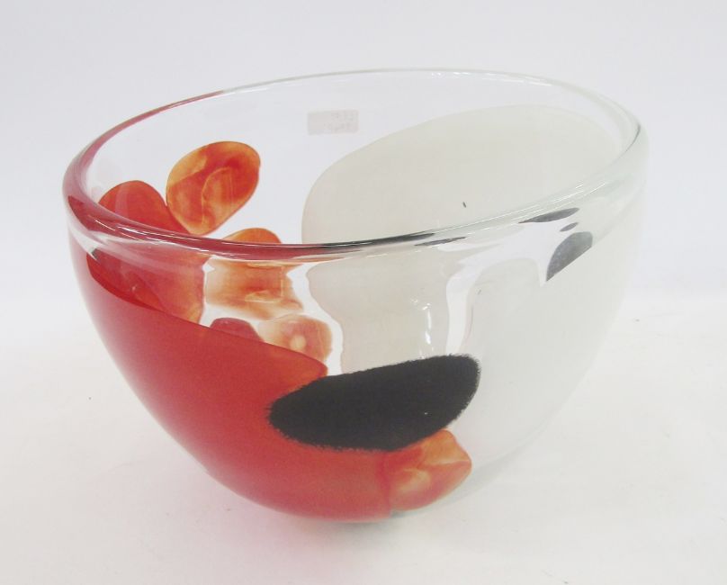 Large Svaja glass bowl, clear with white and red swirl decoration, signed to base, 28cm diameter x 21.5cm high
