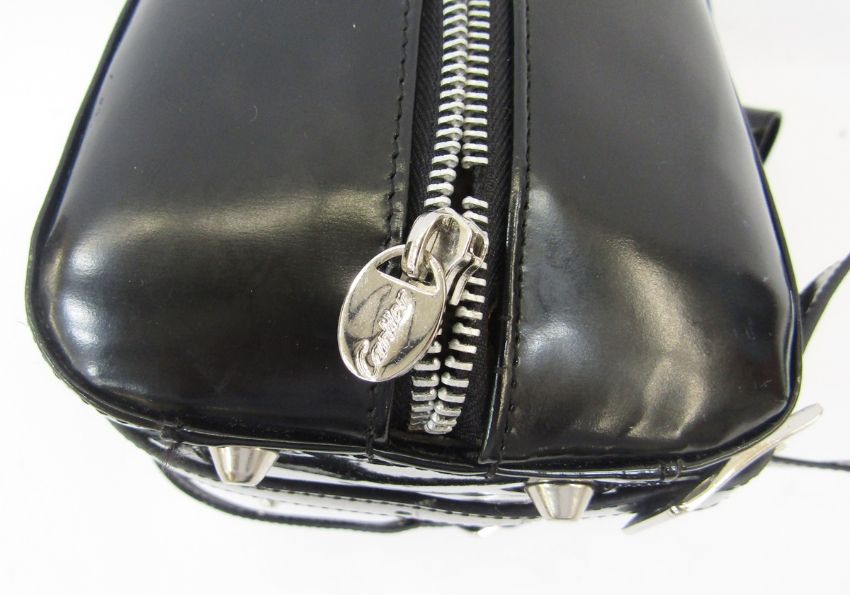 Cartier black patent leather 'Book Bag' with zip fastening (one side of zip damaged), the Cartier leopard logo to the front fastening, printed interior, with a zipped interior and backpack-style straps