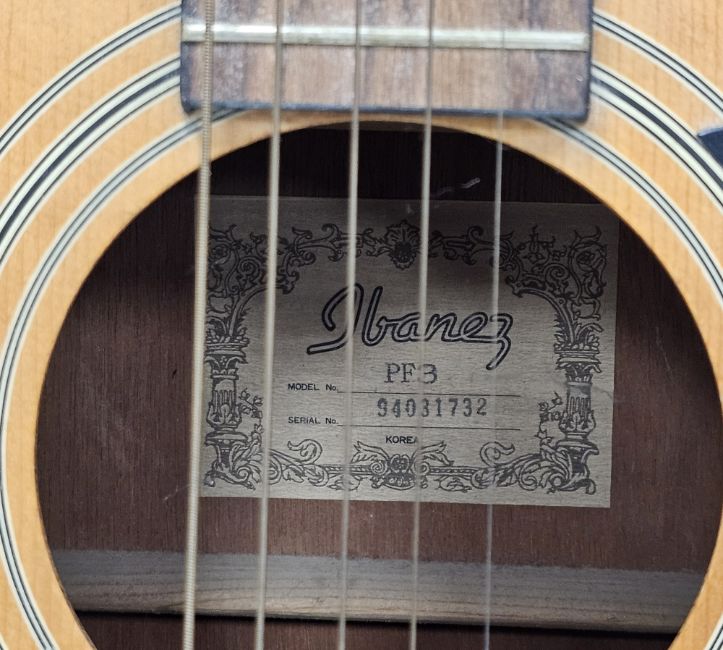 Korean Ibanez PF3 acoustic guitar, six steel string (one string missing), serial number 94031732, 103cm long