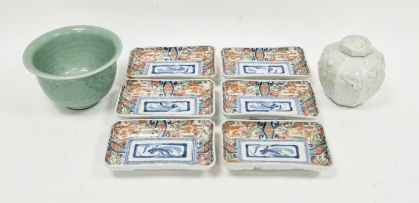 Chinese celadon peony bowl, moulded with peony amongst scrolling leaves, with dark brown washed base and footrim, probably 19th century, six Japanese Meiji period (1868-1912) shaped rectangular supper dishes, decorated in the imari palette with cranes, bamboo and flowers, the undersides with ribbon tied scrolls (damages and repairs), 18.8cm wide, a Chinese white glazed porcelain faceted baluster tea caddy and cover moulded in relief with figures of immortals above waves, 13.5cm high (8)  Condition Report The celadon bowl - minor firing flaw to interior of bowl.The teacaddy and cover - with some typical firing blemishes to glaze, very minor footrim chip to the caddy.The Japanese dishes - one with two sections of rim cracked and restuck, with a small loss, minor wear overall, one with firing blemish.