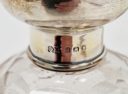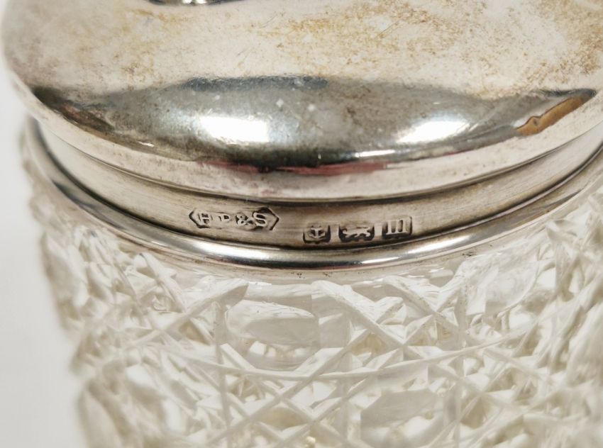 Various Victorian and Edwardian silver-topped cut-glass dressing table jars and bottles, including: a cut-glass globular perfume bottle and stopper, a jar with silver putti heads repousse cover, two faceted cylindrical jars with silver covers, two powder pots, one with pierced silver cover (6)