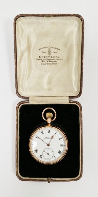 Early 20th century 9ct gold cased open-faced pocket watch, the enamel dial with Roman numerals, seconds subsidiary dial at the half hour mark, dial marked Grant & son, Jarrow on Tyne, in original fitted case, gross weight approximately 87g