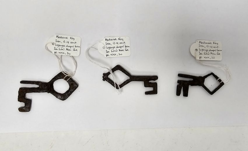 Three medieval iron keys, possibly 14th/15th century, each with lozenge shaped bow, largest 6cm long (3)