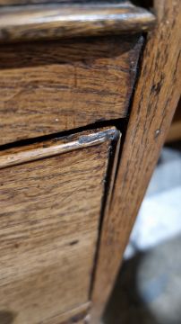 Surface scratches, scuffs and knocks. Fading/discolouration and stains to top. Split to back left corner of top, small area of loss to front left corner of top. Repair to at back right corner of top. No obvious signs of worm. Two small areas of loss to beading around drawers. Repaired section front left of moulding. Item is sturdy. No key present and don't know if locks work. General wear and tear.