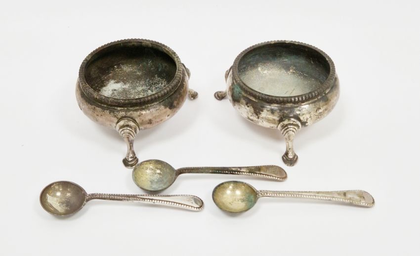 Pair of Victorian silver salts and three matching salt spoons, Birmingham 1884, Elkington & Co, the salts of round form with beaded edge, engraved with the initial W and on three hoofed feet, 7cm wide, the salt spoons old english pattern with beaded edge and engraved with the initial W, approx total weight 3.99ozt