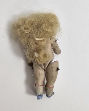 Early 20th century continental bisque miniature doll, with blonde hair, painted facial features, shoes and socks, wired joints, impressed 295 3 to back, 7.5cm high