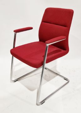 Set of four contemporary Sven Christiansen cantilever chairs, with red fabric upholstered backs, seats and armrests, on a chromed cantilever base, 89cm high x 56cm wide x 55cm deep (PLEASE NOTE VAT WILL BE PAYABLE ON THE HAMMER FOR THIS LOT)