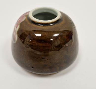 19th century Chinese porcelain brown glazed small tapering vase, blue four-character Wanli apocryphal mark, painted with a pink flower spray on a mottled brown ground, reverse incised with grasses, 6cm high