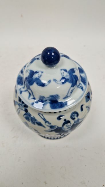 Pair Chinese porcelain blue and white inverse baluster vases and matched covers, 19th century, each painted with figures of musicians and performers, with  domed covers, each with twin concentric circle mark to base, 22cm high (covers later)  Condition Report As described, the covers are matched and are of a different blue tone. One cover with a 2cm chip to rim, the other with a small chip to the underside. One vase has at least three star/hairline cracks to body, the other is ok. Some minor wear overall.