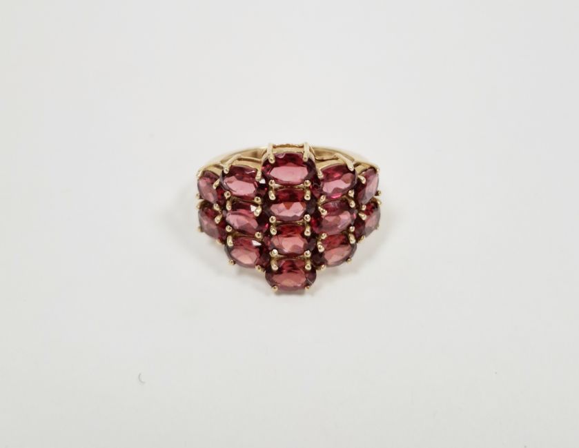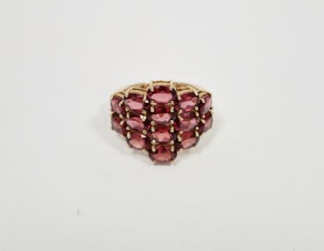 9ct yellow gold lady's dress ring set with a cluster of pink stones, gross weight 4.4g approx, ring size N