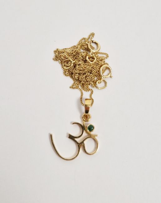 Yellow metal gem set pendant, the loop stamped 18ct, attached to various knotted chains, most of the clasps being stamped 750, gross weight 2.8g approx