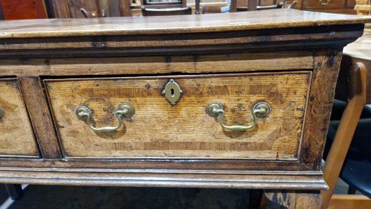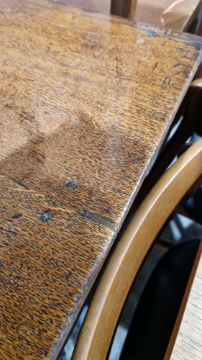 Surface scratches, scuffs and knocks, some fading/discolouration and stains. Repairs to both front legs. Repairs and areas of old worm to both back legs. Handles have been replaced. General wear and tear.