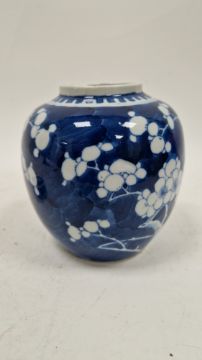 Chip to rim of jar. Cover with two small chips to edge. General wear and tear.