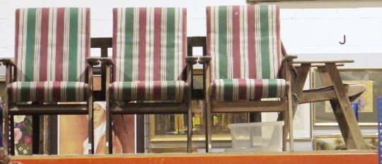 Four Clarecraft Industries teak garden chairs with striped upholstered covers (4)