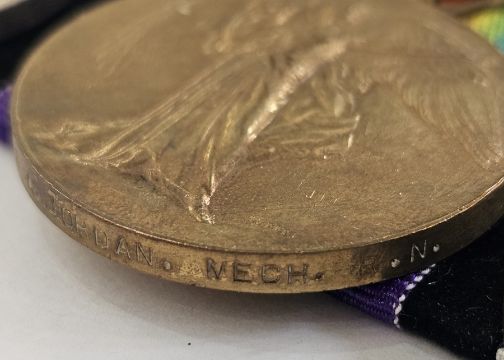 WWI 1915 Star, War Medal, Victory Medal, and Royal Navy Long Service and Good Conduct Medal awarded to "300549.A.JORDAN.MECH.R.N.", Alfred Jordan, born 3rd May 1883, Leicester, Leicestershire, served on HMS Indomitable at the Battle of Jutland. Copy of naval service record.