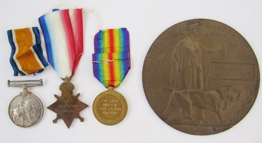 WWI 1915 Star, War Medal and Victory Medal named to "8065.SJT.C.W.TAYLOR.HAMPS.R.". WWI memorial plaque named "CHARLES WILLIAM TAYLOR". Sergeant Taylor, from Winchester, died 29th December 1916 and is remembered on the Baghdad (North Gate) war cemetery.