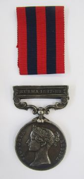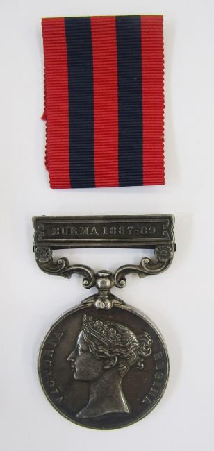 Victorian India General Service Medal with Burma 1887-89 clasp in original box of issue, named to "1038.SERGT.F.A.SHEATH.1st BN.HAMPS.R.". Frank Arthur Sheath, born Newport, Isle of Wight, circa 1866.