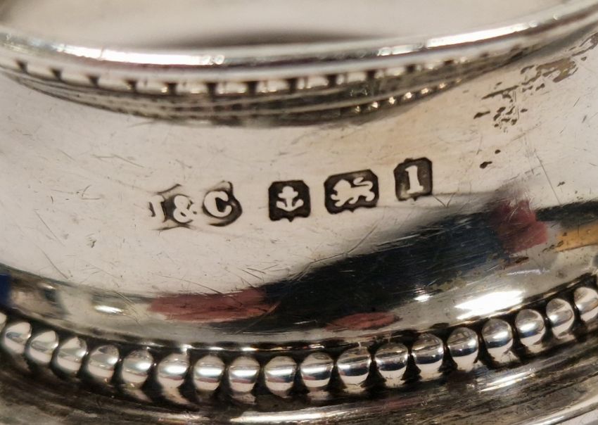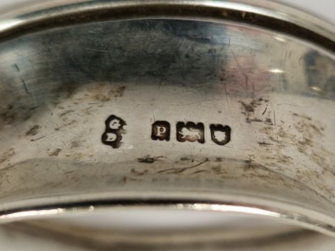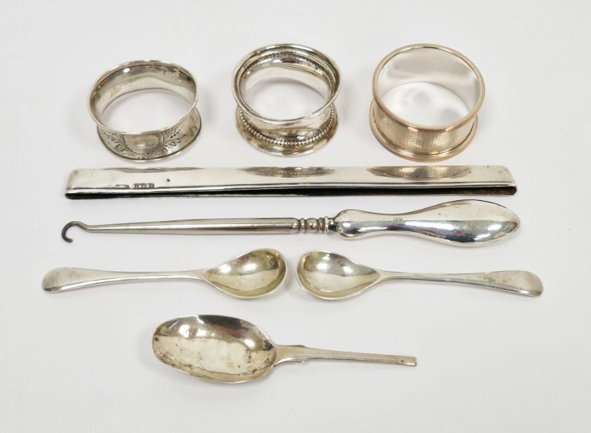 Silver napkin ring with engine-turned decoration, two further silver napkin rings, a pair of silver condiment spoons and other items, weighable silver approx 2ozt