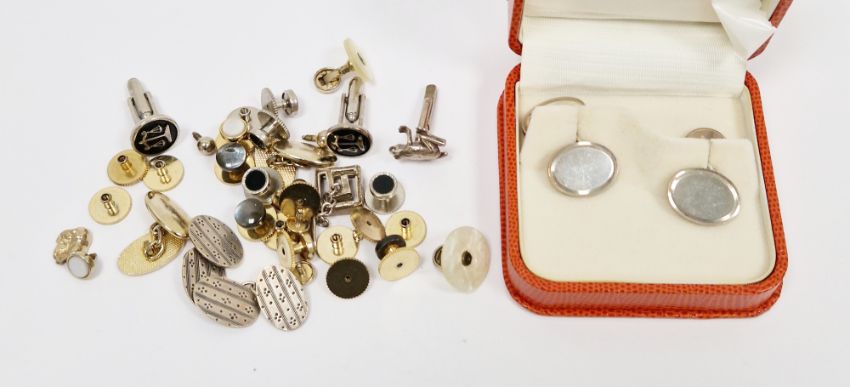 Pair of silver cufflinks with oval polished plates and chain links, in fitted case, and other assorted cufflinks and studs including silver and gilt metal examples