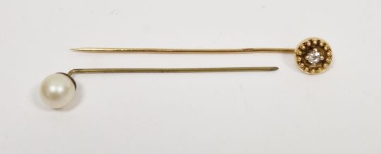 Victorian gold stickpin set with a central diamond within wirework and bead mount, unmarked, approx 1.6g, in fitted case, and a pearl set stickpin (2)
