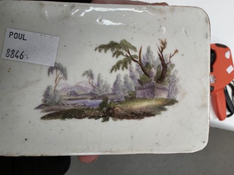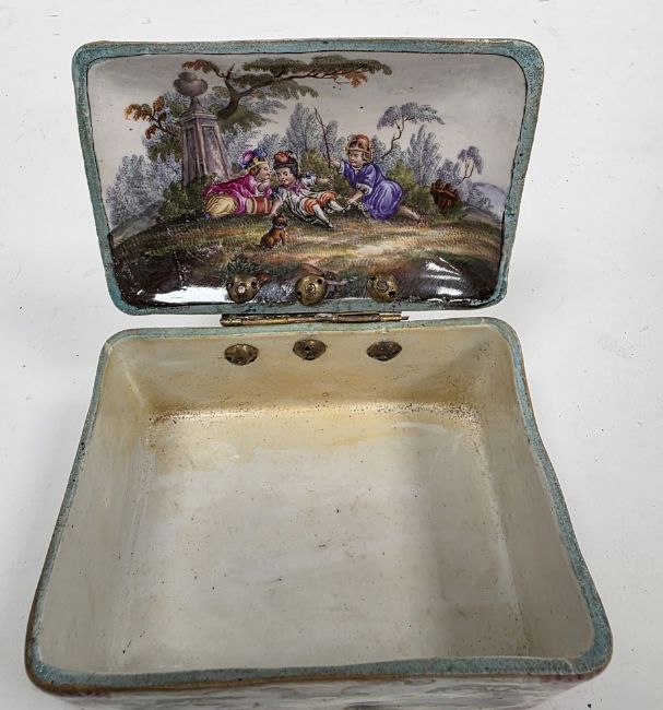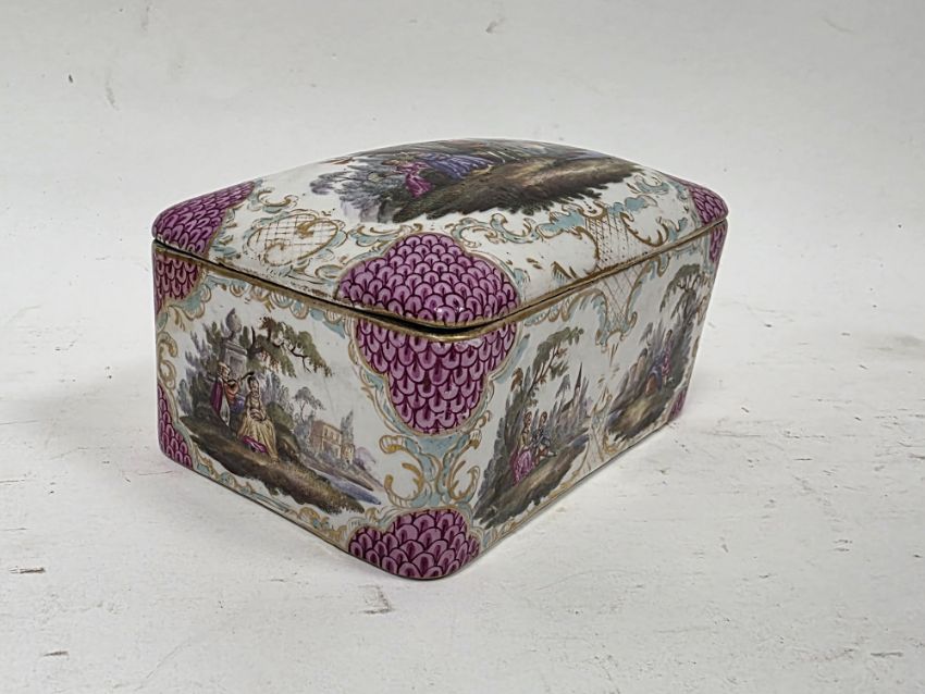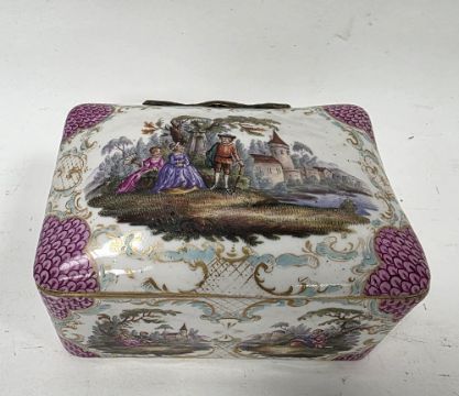 German porcelain small rectangular casket, 19th century, painted in the Meissen-style with figures after Watteau in landscape, within puce scale and gilt scroll rocaille borders (cracked and restored), 12cm wide