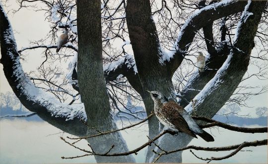 James Renny (British, b.1946) Watercolour and gouache "Fieldfares Among Oaks in Winter", signed and dated '80 lower right, framed and glazed, mount aperture 38cm x 61.5cm, bears McEwan Gallery, Glengarden label vero