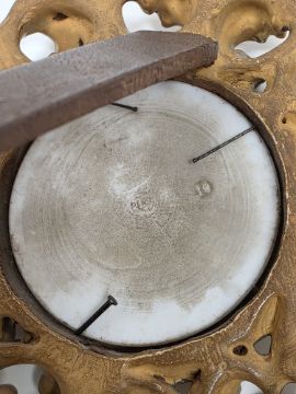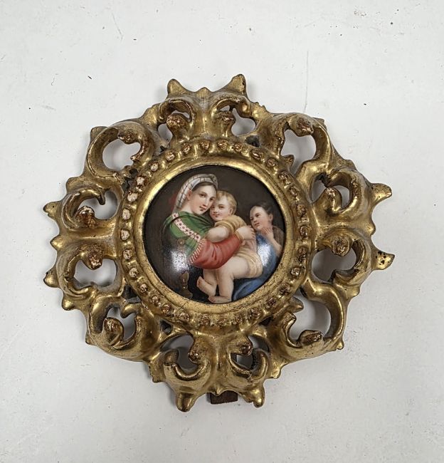 Continental porcelain circular plaque within giltwood frame, mid to late 19th century, decorated in the Berlin K.P.M. style with the Madonna and child and St John, impressed numerals to reverse, within giltwood acanthus frame, 13cm diameter including frame