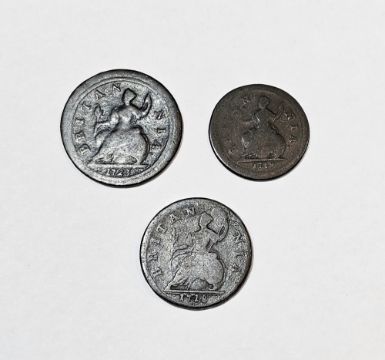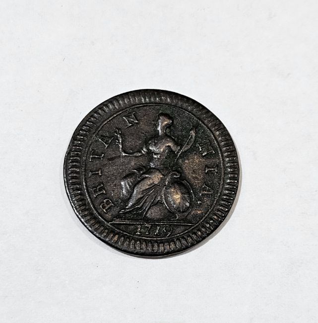George I (1714-1727) copper coinage, 1719 farthing, second issue, some deposits in field, otherwise about very fine, 1723 halfpenny (7.94grms) about fine, 1719 farthing poor, 1718 halfpenny poor (PLEASE NOTE VAT WILL BE PAYABLE ON THE HAMMER)