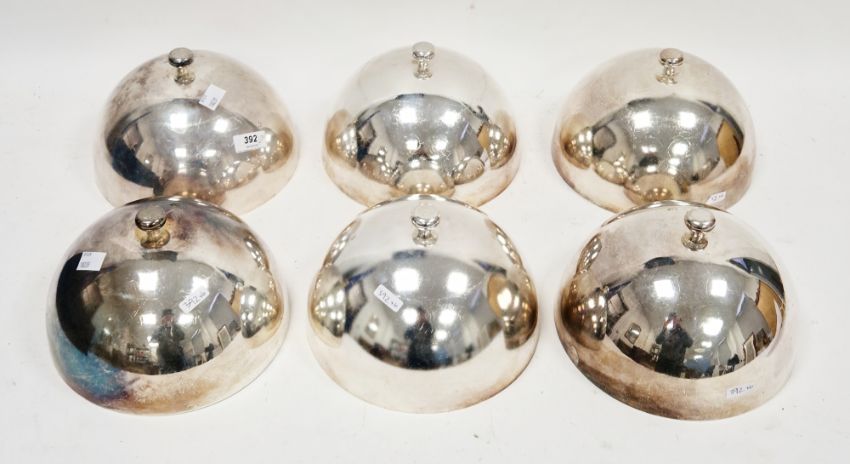 Set of six early 20th century silver-plated meat domes, of plain round form with knob handles to top, 13cm high x 21cm diameter