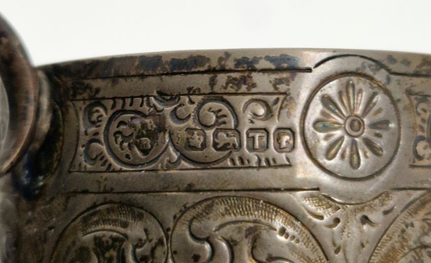 Victorian silver milk jug by Howell & James Ltd, Sheffield 1886, of circular form with engraved decoration and scroll handle, 5.5cm high, approx 1ozt