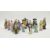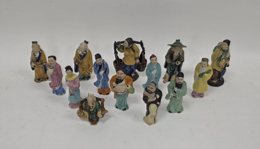 Group of Chinese Shiwan mudman figures of small size, including a water carrier, man with an umbrella, another with a fruit, 20th century impressed china marks and a group of Chinese slipcast porcelain figures similar, each modelled standing, some with attributes, coloured in a bright palette, tallest 12.5cm high max (14)