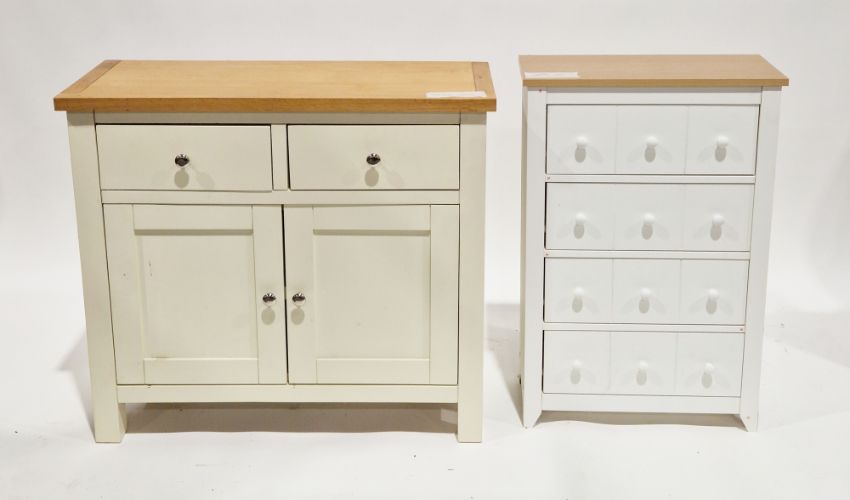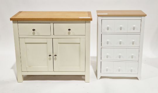 Modern side cabinet with oak-effect top over a French grey finished base of two drawers and two cupboard doors with chromed knob handles, on square feet, 80cm high x 90cm long x 35.5cm deep and a modern white laminate chest with a beechwood laminate top comprising three long drawers with knob handles, 82cm high x 55.5cm wide x 24cm deep (2)